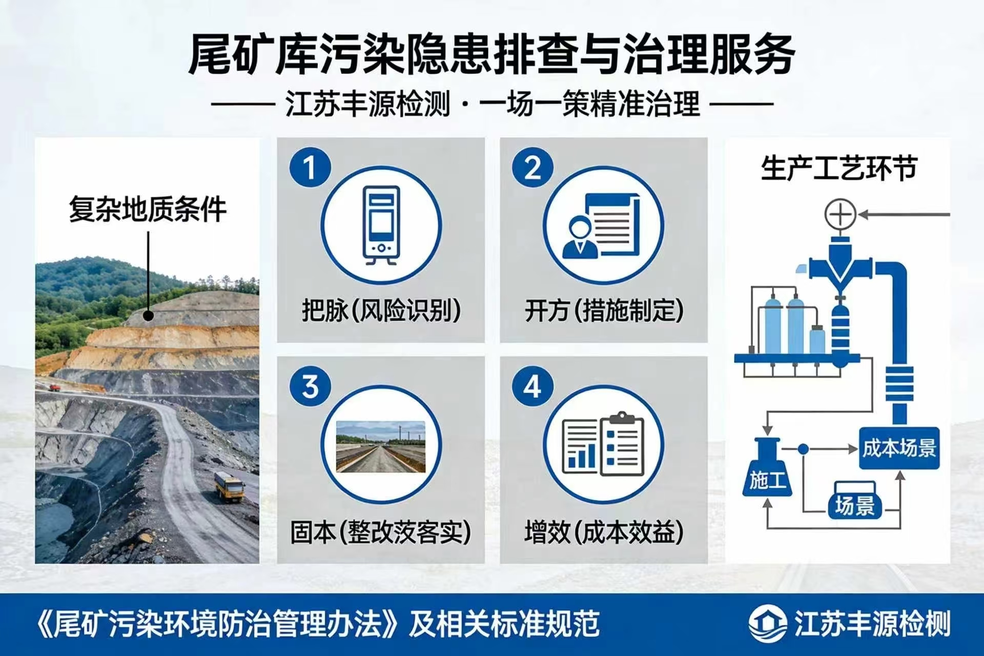 随着国家对尾矿库环境监管力度持续加强,污染隐患排查治理已成为矿山企业必须面对的核心合规议题。如何精准识别隐患、科学制定措施、高效落实整改,同时兼顾成本与效益?【江苏丰源检测】作为专业环境风险技术服务商,推出尾矿库污染隐患排查“一场一策”精准治理服务,通过“把脉、开方、固本、增效”四步法,为您量身定制从排查到治理的全链条解决方案。