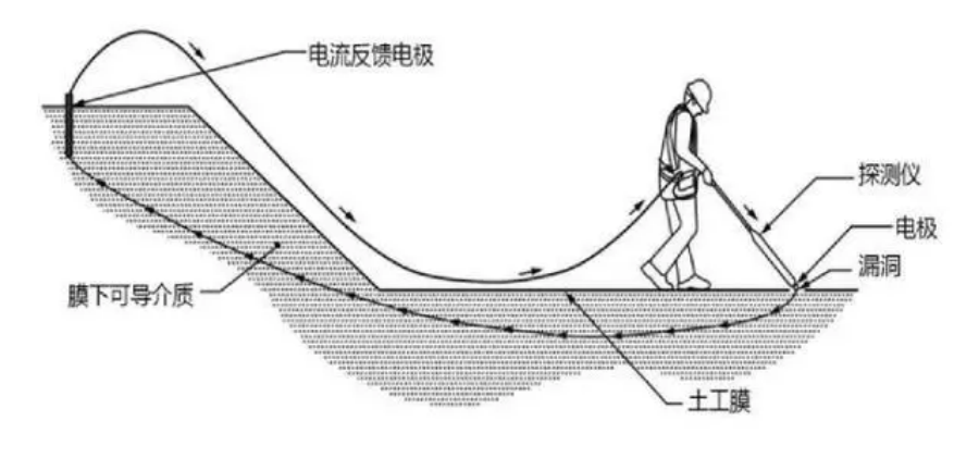 在检测探头和土工膜底部导电媒介之间引入高压。使用检测探头扫描土工膜,检测电流通过泄漏位置完成闭合电路,定位泄漏点位。当电流形成闭合电路时,形成明显电火花,电流同时转化为声音、灯光或其他警报,确认泄漏检测和定位。